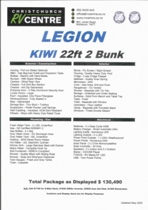 - All Legion caravans in stock have the NZ spec (New Zealand exclusive package).